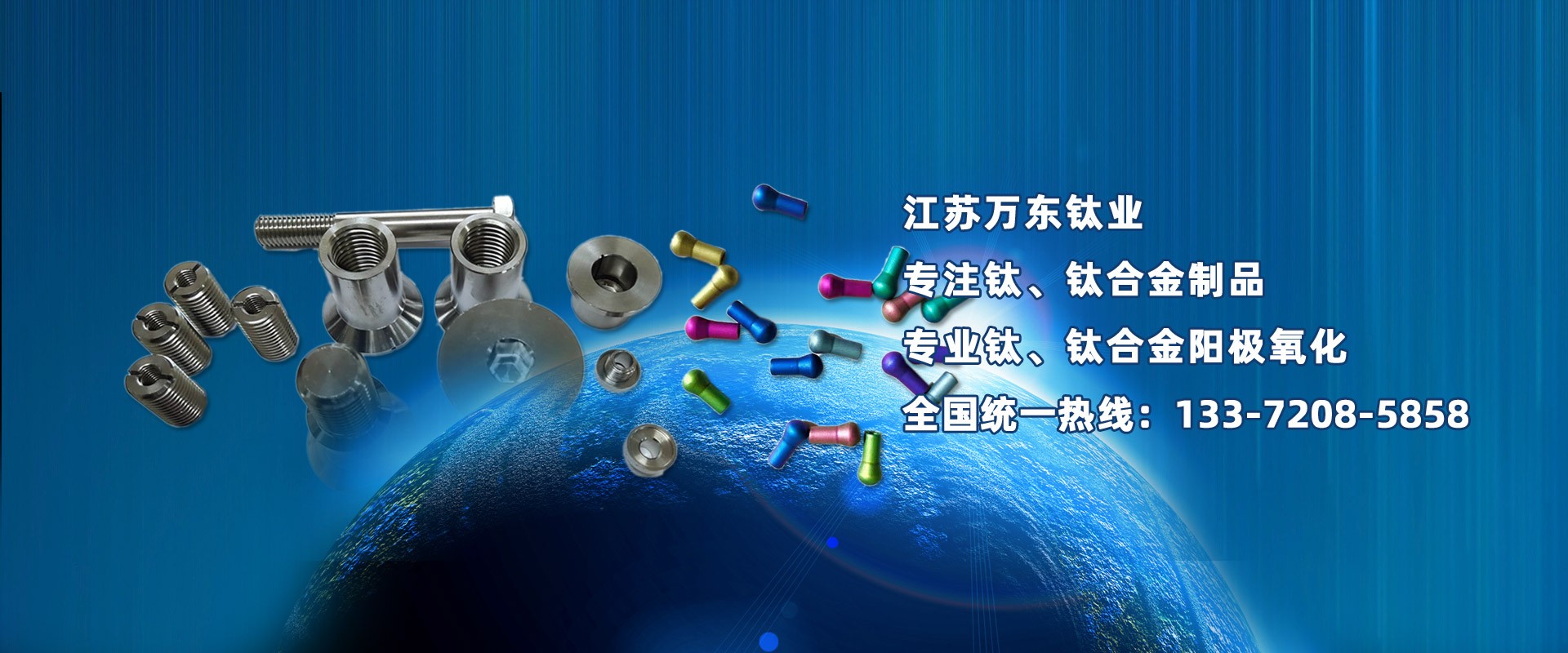 江蘇萬(wàn)東鈦業(yè)科技有限公司坐落于中國(guó)江蘇省南通市,擁有28年的鈦合金研發(fā)技術(shù),公司專(zhuān)業(yè)從事:鈦陽(yáng)極氧化、鈦合金陽(yáng)極氧化、脈沖氧化。鈦合金緊固件生產(chǎn):M0.6以上高品質(zhì):螺絲、螺母、螺柱、螺套、可根據(jù)用戶(hù)的特殊要求定制。